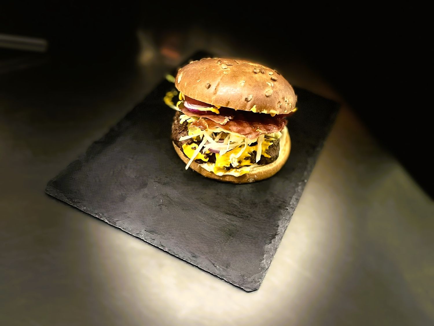 Carne de vita Black Angus, branza cedar, rosii, ceapa rosie, castraveti murati, salata iceberg, sos ramoulade, ketchup mustar, chifla si o portie de cartofi wedges, 350 g