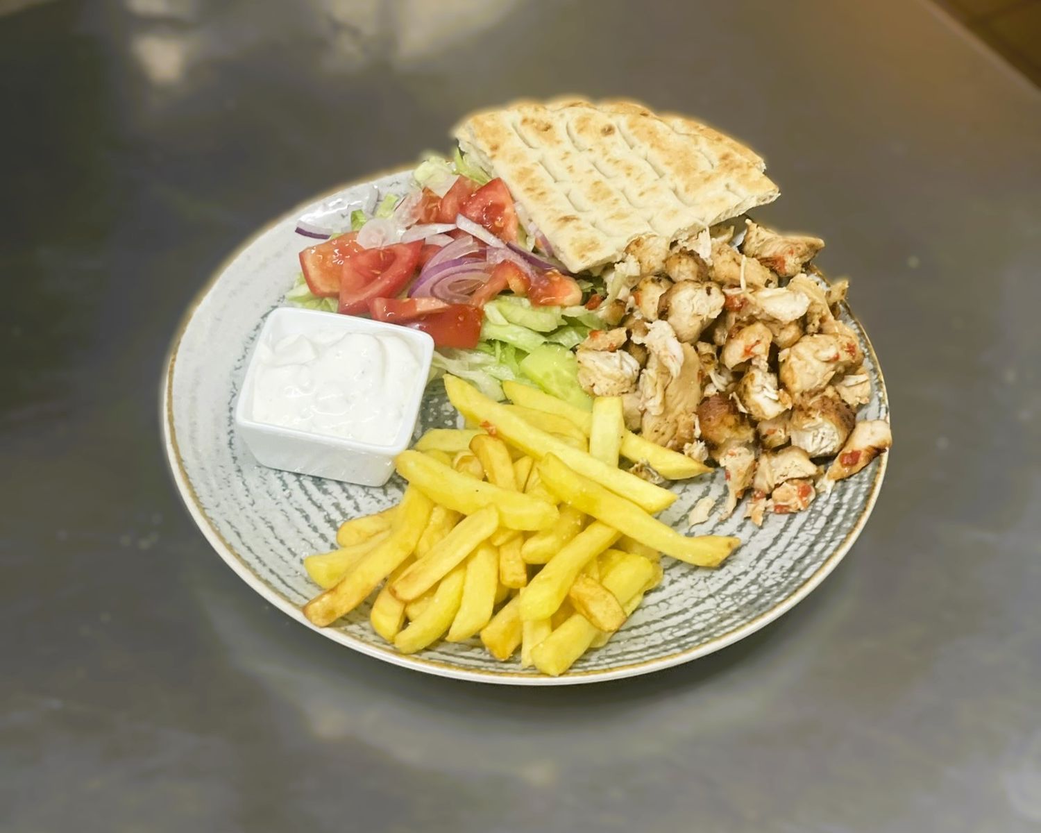 Carne de porc condimentata, cartofi prajiti, rosii, castraveti, ceapa,sos tzaziki, pita servite la farfurie, 350g