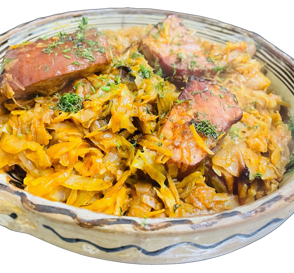 Un preparat tradițional, bogat în arome, perfect pentru o masă sățioasă! Varza albă gătită lent alături de ciolan afumat, ceapă, bulion și condimente aromate, rezulă un gust autentic și savuros.